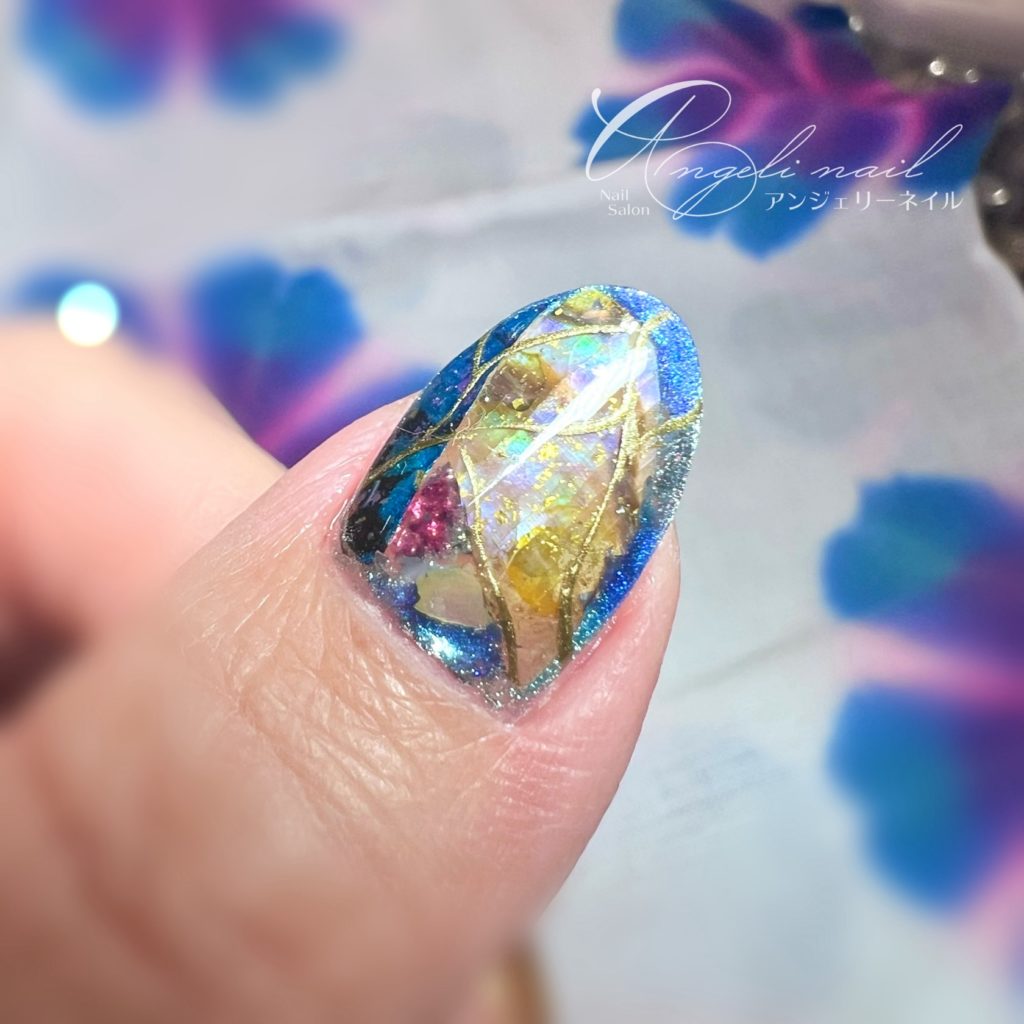 伝統工芸ネイルは、ネイリストの山田愛理先生が考案され、伝統工芸品をネイル用の素材にしたものを乗せたデザイン。螺鈿彩、西陣箔、七宝フレーク、漆など、日本古来からあるものをネイルという現代のファッションに落とし込んでおり、希少性、デザイン性、芸術性、どれをとっても文句なしの美しさです。